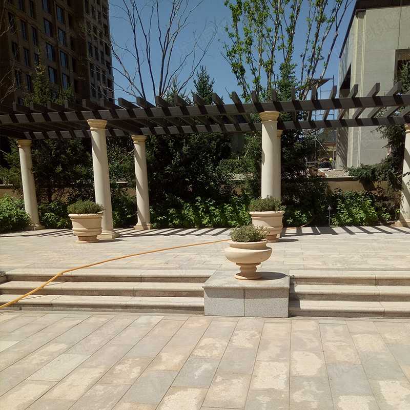 高端天然大理石——進口埃及米黃大理石,項目包括兩個大型大理石噴泉,40余個大理石花盆,18根羅馬柱,